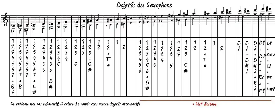 Voici un tableau non exhaustif des doigtés du grave et de l'aigu. Les grosses notes sont les notes lues, et les petites les notes réelles entendues pour un saxophone alto (instrument transpositeur, en Mi♭). Un saxophone alto, en Mi♭, sonne une sixte majeure plus bas que ce qu'il lit : lorsque le saxophoniste alto lit et joue un do sur une partition, la note réelle entendue est un Mi♭ situé une sixte majeure plus bas.