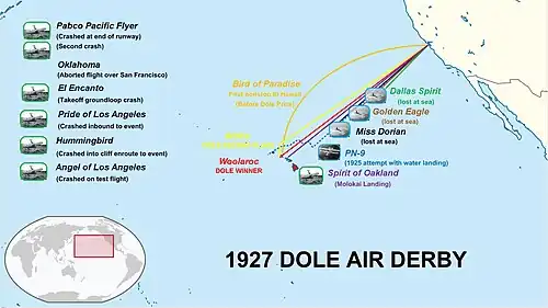 Inspiré par le succès du vol transatlantique de Charles Lindbergh en 1927, James Dole, magnat de l'ananas à Hawaii, offre un prix de 25 000 $ au premier avion à voilure fixe à parcourir les 3 870 kilomètres d'Oakland à Honolulu, et 10 000 $ pour la deuxième place.