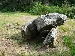 Le dolmen le plus à l'est comprend une table de couverture (1,90 m sur 2,40 m et 0,40 m d'épaisseur). La chambre est délimitée par quatre orthostates dont trois supportent la table de couverture. Selon du Châtellier, le sol de la chambre sous la table était pavé de pierres brutes sur lesquelles s'étendait une couche de sable jaune. Il découvrit, au fond de la chambre, un silex noir taillé d'un seul côté en forme de pointe de lance, sur le côté est de la chambre, un petit vase en terre contenant de petites rondelles en ardoise, très fragiles, et des plaquettes en ardoise couvertes de lignes gravées, et, au nord, un second vase de couleur noire, à fond rond, décoré de petits mamelons coniques près du bord supérieur. La couche archéologique contenait aussi des charbons de bois et quelques fragments osseux[2].