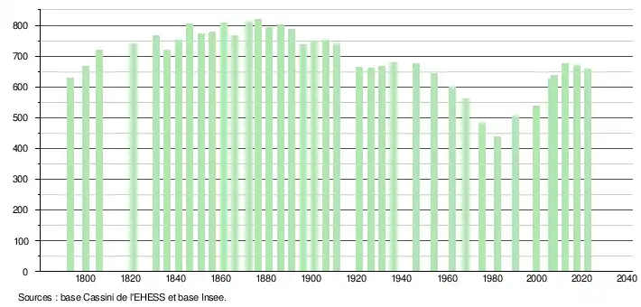 L'évolution du nombre d'habitants est connue à travers les recensements de la population effectués dans la commune depuis 1793. Pour les communes de moins de 10 000 habitants, une enquête de recensement portant sur toute la population est réalisée tous les cinq ans, les populations de référence des années intermédiaires étant quant à elles estimées par interpolation ou extrapolation[23]. Pour la commune, le premier recensement exhaustif entrant dans le cadre du nouveau dispositif a été réalisé en 2007[24].