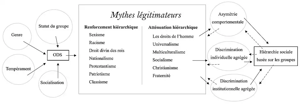 Les mythes légitimateurs sont l’ensemble des normes, valeurs, croyances, idéologies, attitudes et stéréotypes socialement partagés. Ces mythes viennent réguler les mécanismes d’oppression (discrimination individuelle agrégée, discrimination institutionnelle agrégée, asymétrie comportementale) de la hiérarchie sociale basée sur les groupes. Aussi, ces mythes sont fonctionnels, selon qu’ils supportent (Hierarchy-Enhancing) ou atténuent (Hierarchy-Attenuating) le système de hiérarchie sociale basée sur les groupes. De ce fait, les mythes de l’ensauvagement, du grand remplacement, de la méritocratie servent des idéologies racistes et élitistes qui vont favoriser le système de domination sociale. D’autre part, le multiculturalisme, le socialisme et le féminisme servent des idéologies égalitaires qui vont à l’encontre de la hiérarchie sociale. Ces forces contradictoires se contrebalancent et permettent la stabilité du système de hiérarchie sociale basée sur les groupes. Bien que les mythes légitimateurs soient parfois corrélés aux positions politiques, – les mythes HE seraient de « droite » et les mythes HA de « gauche » –, des exemples tels que celui de la nomenklatura font exceptions. Aussi les dirigeants du parti communiste se servaient de mythes paternalistes – l’hégémonie dominante sert les intérêts des dominés incapables de défendre leurs intérêts – afin de justifier leur contrôle monopoliste de l’État. L’adhésion du sujet à des mythes légitimateurs HE ou HA est dépendante de sa disposition préalable à soutenir ou non la stratification sociale. Cette adhésion du sujet au système de hiérarchie fondée sur les groupes est mesurée par l’Orientation de Dominance Sociale (ODS) – Social Dominance Orientation (SDO) en anglais.