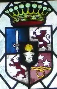 Ecartelé au premier d’azur à l’épée d’argent, la pointe en haut ; au deuxième et troisième d'argent, au lion rampant, lampassé et armé d'un sabre, le tout de gueules; au quatrième de pourpre chargé en chef de trois étoiles d'argent posées une et deux, en face de deux serpents contrepassant d'or; en pointe d'un serpent de même se mordant la queue ; sur le tout, en cœur, un écusson de sable, au buste sans tête ni bras d’idole saxonne, d’argent, à trois seins, surmonté d’un soleil d’or.
