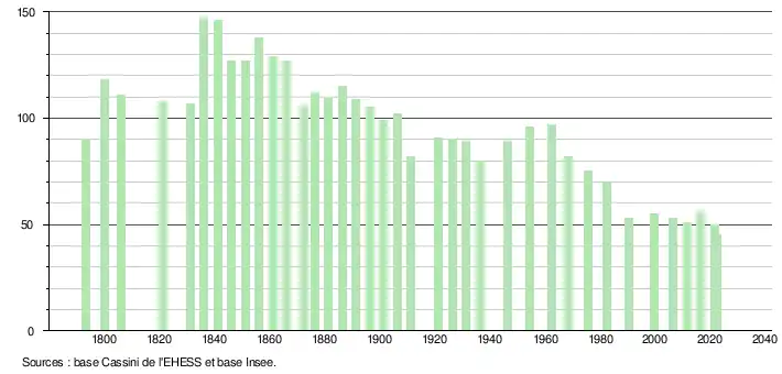 L'évolution du nombre d'habitants est connue à travers les recensements de la population effectués dans la commune depuis 1793. Pour les communes de moins de 10 000 habitants, une enquête de recensement portant sur toute la population est réalisée tous les cinq ans, les populations de référence des années intermédiaires étant quant à elles estimées par interpolation ou extrapolation[21]. Pour la commune, le premier recensement exhaustif entrant dans le cadre du nouveau dispositif a été réalisé en 2006[22].