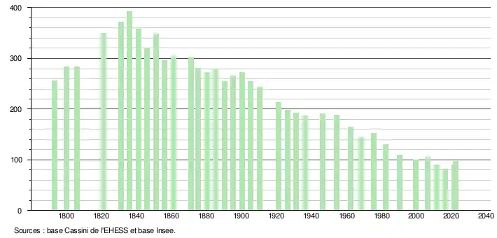 L'évolution du nombre d'habitants est connue à travers les recensements de la population effectués dans la commune depuis 1793. Pour les communes de moins de 10 000 habitants, une enquête de recensement portant sur toute la population est réalisée tous les cinq ans, les populations de référence des années intermédiaires étant quant à elles estimées par interpolation ou extrapolation[16]. Pour la commune, le premier recensement exhaustif entrant dans le cadre du nouveau dispositif a été réalisé en 2006[17].