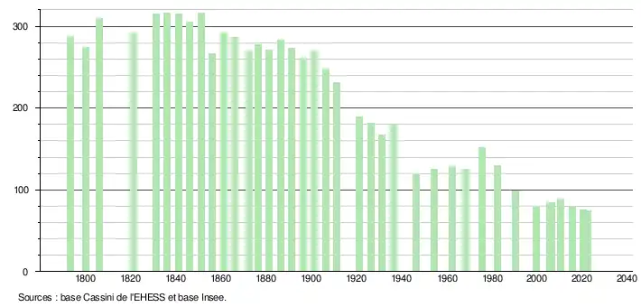 L'évolution du nombre d'habitants est connue à travers les recensements de la population effectués dans la commune depuis 1793. Pour les communes de moins de 10 000 habitants, une enquête de recensement portant sur toute la population est réalisée tous les cinq ans, les populations de référence des années intermédiaires étant quant à elles estimées par interpolation ou extrapolation[17]. Pour la commune, le premier recensement exhaustif entrant dans le cadre du nouveau dispositif a été réalisé en 2005[18].