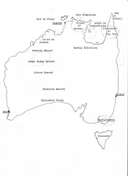 - ↑ Le cap York, tout au nord-est du continent australien, est séparé de la Nouvelle-Guinée (au nord) par le Détroit de Torres, et bordé à l'est par la mer de Corail, et à l'ouest par le golfe de Carpentarie