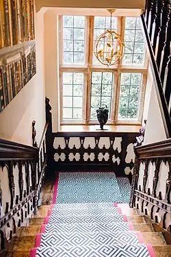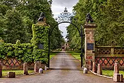 La reconstruction du terrain par William Nesfield en 1861-1862 aboutit à plusieurs structures qui sont maintenant répertoriées. Le pavillon de porte de style jacobéen sur Chester Road est en brique rouge avec des pansements en pierre et une décoration en brique bleue. La tour de l'horloge au-dessus de la remise comporte des cadres en pierre pour les cadrans de l'horloge et est surmontée d'un faîteau en bois avec une girouette. Une grande statue en fer d'un dogue avec des chiots recouvrant un bol de nourriture se dresse sur le parvis de la salle; il est attribué à Pierre Louis Rouillard et provient de l'exposition de Paris de 1855[11].