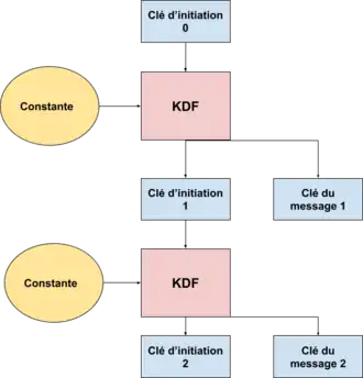 Comme indiqué précédemment, la dérivation de clé fonctionne sous forme de chaîne[4]. On part d'une clé secrète partagée et d'une entrée (un sel ou un poivre) qu'on fournit à la fonction de dérivation. Celle-ci fournit deux nouvelles clés : une clé de chiffrement ou déchiffrement pour le prochain message, et une clé d'initiation pour la fonction de dérivation KDF.
