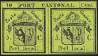 Un Double reprenait deux fois le même timbre non dentelé illustré par les armes de Genève et les mentions « Poste Genève », « 5. C. » (5 centimes) et « Port local. ». Au-dessus, une bande liait les deux vignettes avec la mention : « 10. | PORT CANTONAL | Cent. » (10 centimes). Si la lettre était postée et destinée à la ville-même, un timbre de 5 centimes suffisait. Pour une lettre à destination des autres communes du canton, mais sans l'enclave de Céligny, les deux timbres étaient nécessaires[1].