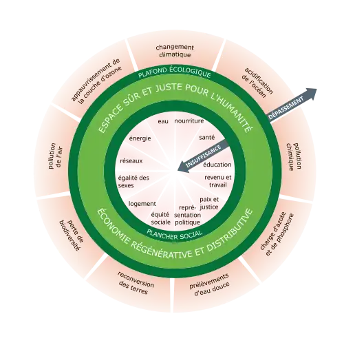 Par conséquent, une économie est considérée comme prospère lorsque les douze fondements sociaux sont réunis sans dépasser aucun des neuf plafonds écologiques. Cette situation est représentée par la zone entre les deux anneaux, à savoir l'espace sûr et juste pour l'humanité. Le diagramme a été développé par l'économiste d'Oxford Kate Raworth dans le document d'Oxfam A Safe and Just Space for Humanity et élaboré dans son livre Doughnut Economics: Seven Ways to Think Like a 21st-Century Economist.