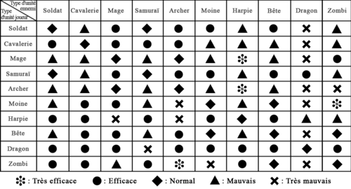 Le joueur est amené à diriger un groupe constitué d'un général et au maximum de cent soldats. Chaque commandant représente une classe particulière : chevalier, moine, magicien, prêtre, ninja, samouraï, etc. Il existe dix types de métiers principaux, chacun apportant des tactiques, compétences ou sorts de magie divers[11]. La victoire dans une bataille rapportent des points d'expérience dont l'accumulation est nécessaire aux personnages pour gravir des niveaux, qui eux-mêmes engendrent une augmentation des caractéristiques – vie, magie, force et commandement – et de nouvelles compétences. Un général utilise les services d'un type de troupes spécifiques : soldats, cavalerie, archers, harpies, zombis, dragons, etc. Au commencement, un commandant accède à une, voire plus, catégorie de combattants. D'autres se débloquent au moyen d'objets découverts dans les châteaux. Selon sa catégorie, une armée est plus ou moins efficace contre un autre type de troupes[6],[4]. Ce paramètre a une influence prépondérante sur l'issue du conflit. Par exemple, un nombre restreint de soldats particulièrement efficace peut détruire un groupe de combattants plus nombreux mais moins puissants[10].