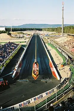 Les véhicules se présentent par deux, côte à côte, chacun dans son couloir. En bout de piste on trouve des panneaux d'affichage électronique dispensant les temps de chaque concurrent. La zone suivant la ligne d'arrivée est en général assez longue, pour permettre aux engins de s'arrêter. Les quatre roues utilisent généralement des parachutes pour se ralentir.