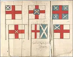 Projets de dessins pour un drapeau de l'Union, c.1604. Charles Howard, 1er comte de Nottingham ajouté sa recommandation et sa signature au dessin du milieu sur la rangée inférieure. Aucun de ceux-ci n'a été adopté[7].Drapeau de la Levant Company hissé sur les navires des Turkey merchants («marchands de Turquie») sous le règne d’ÉlisabethIre: les armoiries royales d'Angleterre surmontées d'une croix de saint Georges avec «fimbriation» blanche. William Gordon Perrin(en) a suggéré que cette conception était une inspiration pour le drapeau britannique[8].