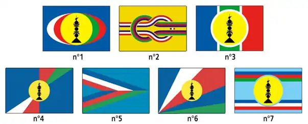 - ↑ Les 7 drapeaux ayant obtenu le plus de suffrages à la consultation menée par Calédonie mon pays en 2004, sur le site www.signes-identitaires-nc.com géré par l'association Génération destin commun