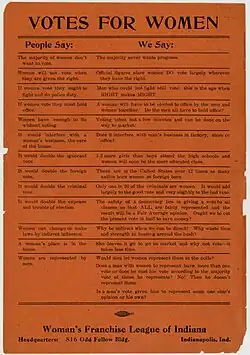 - 1776 : L'article IV de la constitution du New Jersey définit les électeurs comme suit : « tous les habitants de cette colonie, majeurs (...) »[13], alors que les constitutions des autres États précisaient « habitants de sexe masculin ». Cette possibilité de droit de vote des femmes, bien que très limitée par les conditions de propriété, également valables pour les hommes mais de facto plus restrictive pour les femmes (seules les veuves étant effectivement propriétaires, le mari étant le seul propriétaire imposable dans les couples mariés), est explicitement abolie en 1807[14]. Toutefois, le fait que la Cour suprême des États-Unis n'ait pas été saisie à l'époque contre le droit de vote de femmes sera utilisé par la partie demanderesse dans l'affaire Minor v. Happersett en 1874, considérant qu'il n'y a aucune jurisprudence permettant d'établir que ce droit serait inconstitutionnel.