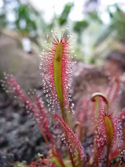 Les feuilles de droséra sont recouvertes de poils de taille comprise entre quelques millimètres et un centimètre. Au bout de chacun de ces poils se trouve la zone endodermoïde, pied d'un amas — qui peut être, en fonction de l'espèce, transparent, vert[N 1] ou rouge[N 2] — de cellules sécrétant le mucilage (le parenchyme glandulaire)[réf. nécessaire].