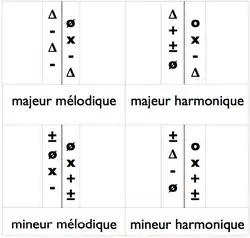 Par exemple, c∆- correspond à do majeur et g±ø correspond à sol mineur harmonique.