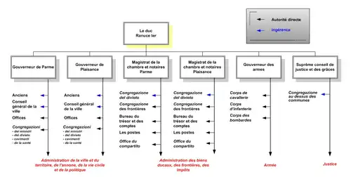 Sous les Farnèse, le duché ne connaît qu'un régime absolutiste sous l'autorité du duc[5]. Dans la continuité de l'administration pontificale, une administration est constituée avec la nomination, par le duc Pierre-Louis Farnèse, des gouverneurs des villes de Parme et Plaisance (les podestà) et d'un conseil de justice[6].