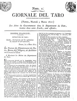 Lors de l'occupation française, le territoire est divisé en quatre circonscriptions administrés par un sous-préfet dont les chefs-lieux sont Parme, Plaisance, Borgo San Donnino (actuellement Fidenza) et Guastalla, auxquels s'ajoute en 1806 Bardi. En 1806, le territoire de Guastalla est cédé à Pauline Bonaparte[29]. Les territoires parmesans sont divisés par le préfet Hugues Nardon en treize communes avant de devenir le département français du Taro en 1808. Il intègre pleinement les institutions françaises, le département dispose de six députés membres du Corps législatif[30].