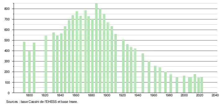 L'évolution du nombre d'habitants est connue à travers les recensements de la population effectués dans la commune depuis 1793. Pour les communes de moins de 10 000 habitants, une enquête de recensement portant sur toute la population est réalisée tous les cinq ans, les populations de référence des années intermédiaires étant quant à elles estimées par interpolation ou extrapolation[16]. Pour la commune, le premier recensement exhaustif entrant dans le cadre du nouveau dispositif a été réalisé en 2008[17].