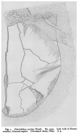 Les premiers restes de Dunkleosteus sont découverts par le géologue Jay Terrell en 1867, près du lac Érié, au sein de la ville de Sheffield Lake, (Ohio)[5]. Ils se compose d'un crâne partiel et d'une plaque de protection thoracique dorsale, détruite plus tard dans un incendie à Elyria. Après la découverte de plus de fossiles de l'animal, le géologue John Strong Newberry donné le nom de Dinichthys terrelli en 1873, en l'honneur du découvreur[6].