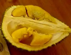 Ce fruit, lui aussi appelé durian, est récolté en Asie du Sud-Est (et au Bangladesh) mais également dans les îles du Pacifique et en Amérique du Sud. On en trouve, par exemple, sur les marchés de Guyane fin mars, début avril. Il se présente comme une grosse baie ovoïde (parfois plus de 40 cm de longueur), pesant jusqu'à kg, avec une carapace de grosses épines et poussant en haut de grands arbres. Il est connu pour son goût particulier et sa forte odeur (à tel point que de nombreux pays d'Asie du Sud-Est l'interdisent dans les lieux publics et dans les transports en commun).