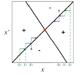 On peut ensuite étudier la convergence de la dynamique vers cet équilibre en prenant des valeurs x0 et x’0 dans les régions positives et on regarde ensuite dans quelle direction va l’invasion par le mutant. On répète ceci en prenant de nouvelles valeurs (de x0 en x2). Si on se dirige vers l’équilibre, alors la dynamique est convergente si on va dans le sens inverse, alors elle est non convergente.Toujours dans la Figure 4 on voit que dans les deux cas de régions positives (X’ > Xn et X’ < Xn) la population de mutant x’ converge vers l’équilibre x* . On a donc dans cet exemple un équilibre stable et convergent et donc une stratégie continuellement stable (CSS). On retrouve donc les résultats obtenus par l’approche mathématique.