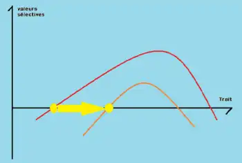 La Figure 2 nous montre la variation de la valeur sélective en fonction du trait. Ici la flèche jaune représente la mutation d'un trait, ce qui va ainsi changer le paysage adaptatif. Ce graphique permet de visualiser la dynamique du paysage adaptatif.