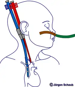 Dans l'ECMO veino-veineuse, une canule de sortie veineuse est placée dans la veine fémorale et une canule de retour est insérée dans la veine jugulaire interne. Certaines ECMO sont canulées grâce à un cathéter à double lumière inséré dans la jugulaire interne, qui extrait le sang de la veine cave supérieure, et le ramenant dans l'oreillette droite[9].