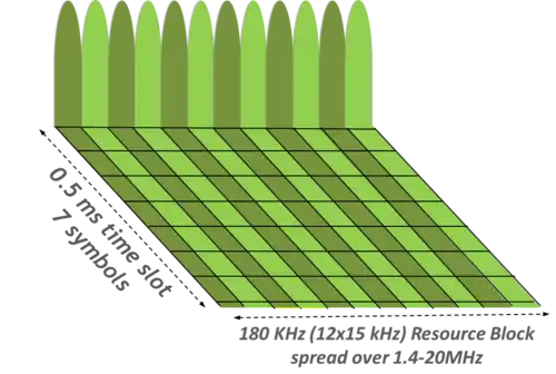 L’unité de base attribuée à un abonné est le « Resource Block »[3] (voir dessin). Chaque Resource Block (bloc de ressources radio) est constitué de 12 sous-porteuses de 15 kHz de largeur et de 7 symboles temporels[4] ayant une durée totale de 0,5 ms. Un nombre variable de Resource blocks peut être attribué chaque seconde à un même terminal mobile (user equipment) en fonction du débit qu’il requiert et des ressources radio disponibles.
