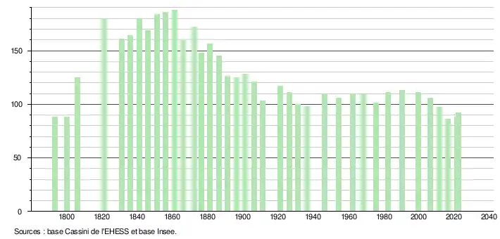 L'évolution du nombre d'habitants est connue à travers les recensements de la population effectués dans la commune depuis 1793. Pour les communes de moins de 10 000 habitants, une enquête de recensement portant sur toute la population est réalisée tous les cinq ans, les populations de référence des années intermédiaires étant quant à elles estimées par interpolation ou extrapolation[24]. Pour la commune, le premier recensement exhaustif entrant dans le cadre du nouveau dispositif a été réalisé en 2006[25].