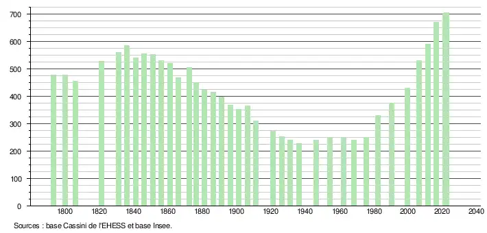 L'évolution du nombre d'habitants est connue à travers les recensements de la population effectués dans la commune depuis 1793. Pour les communes de moins de 10 000 habitants, une enquête de recensement portant sur toute la population est réalisée tous les cinq ans, les populations de référence des années intermédiaires étant quant à elles estimées par interpolation ou extrapolation[23]. Pour la commune, le premier recensement exhaustif entrant dans le cadre du nouveau dispositif a été réalisé en 2006[24].