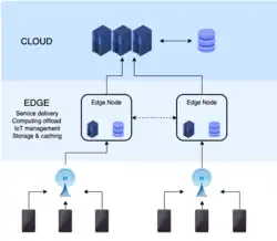 L'edge computing permet aussi d'éviter des transmissions de données nombreuses et peu pertinentes vers les centres de données ou le cloud, apportant fluidité et rapidité de réaction[3]. L'edge computing couvre un large éventail de techniques, notamment celle des réseaux de capteurs sans fil, l'acquisition de données transférables et itinérantes, l'analyse des signatures sur portables, le traitement coopératif en peer-to-peer (fog computing, dew computing[4], multi-access edge computing[5],[6], stockage de données réparties, services de cloud à distance, réalité améliorée, et plus encore[7].