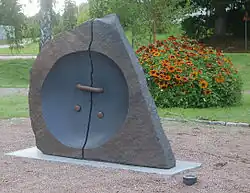 Bouton noir par Hiroshi Koyama, sculpture située à l'extérieur de la gare d'Edsvalla.