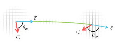 - est l'angle entre la vitesse de l'observateur et la vitesse de la lumière au moment de la réception