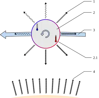 Lors de la révolution d'un astéroïde autour du Soleil, un côté va être plus illuminé que l'autre (et donc recevra plus de photons). Son insolation est donc asymétrique. Il faudra alors un certain temps τ pour réémettre ces photons, pendant lequel l'astéroïde va tourner sur lui-même. Il en résulte donc une force opposée à sa direction de réémission (voir Fig. 3, et la pression de radiation). L'effet Yarkovsky est donc la force qui résulte de cette réémission du photon : c'est un effet différé dans le temps, contrairement à la pression de radiation classique.