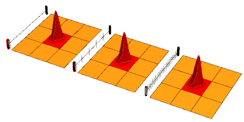 Avec le nombre croissant de mesures, la fonction d'onde a tendance à rester dans sa forme initiale. Dans l'animation, une évolution libre dans le temps d'une fonction d'onde, représentée à gauche. Dans la partie centrale, elle est interrompue par des mesures de position occasionnelles qui localisent la fonction d'onde dans l'un des neuf secteurs. À droite, une série de mesures très fréquentes conduit à l'effet Zénon.