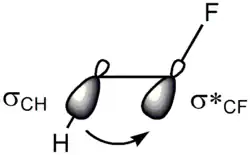 - l'hyperconjugaison s'expliquerait par un transfert de densité électronique depuis l'orbitale liante de la liaison σ C–H vers l'orbitale antiliante σ* de la liaison C–F, ce qui stabiliserait le conformère gauche. L'électronégativité plus élevée du fluor fait de l'orbitale σ de la liaison C–H un meilleur donneur d'électrons que l'orbitale σ de la liaison C–F, tandis que l'orbitale σ* de la liaison C–F est un meilleur accepteur d'électrons que l'orbitale σ* de la liaison C–H. La configuration gauche optimise le transfert d'électrons entre ces orbitales ;