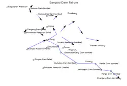 Le 8 août, à 01h00, l'eau du Banqiao a culminé à 117,94 m au-dessus du niveau de la mer, soit 0,3 mètre plus haut que le mur de protection contre les vagues du barrage, ce qui a fait qu'il a cédé. La même tempête a provoqué la rupture de 62 barrages au total. Le ruissellement du barrage de Banqiao était de 13 000 m3 par seconde en entrée contre 78 800 m3 par seconde en sortie, et par conséquent 701 millions de m3 d'eau ont été libérés en 6 heures[12], tandis que 1,67 milliard de m3 d'eau ont été libérés dans 5,5 heures à un barrage de Shimantan en amont, et 15,738 milliards de m3 d'eau ont été libérés au total[3].