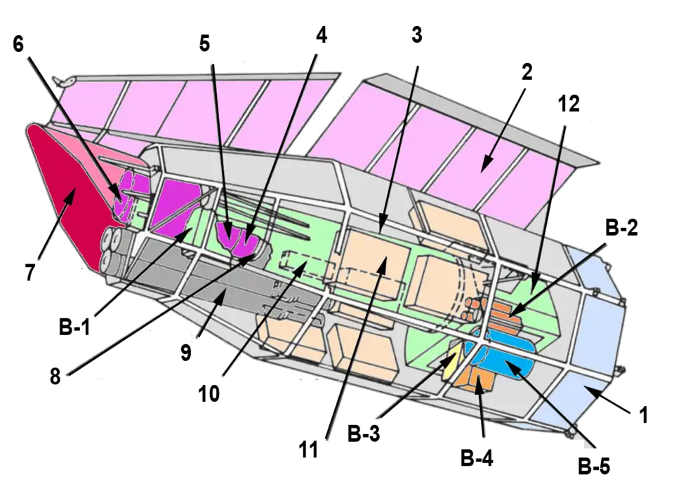 Schéma d'HEAO 2 : B-1 : Compteur proportionnel à gaz - B-2 : Détecteur de la caméra haute définition - B-3 : Spectromètre à cristal - B-4 : Compteur proportionnel à gaz - B-5 : Spectromètre à détecteur solide - 1 : Plateforme/bus - 2 : Panneau solaire - 3 : Banc optique - 4 : Précollimateur arrière - 5 : Optique Wolter - 6 : Précollimateur avant - 7 : Pare-Soleil - 8 : Filtres et spectromètre à grilles - 9 : Viseurs d'étoiles - 10 : Emplacements réservés aux expériences - 11 : Électronique centrale - 12 : Plan focal