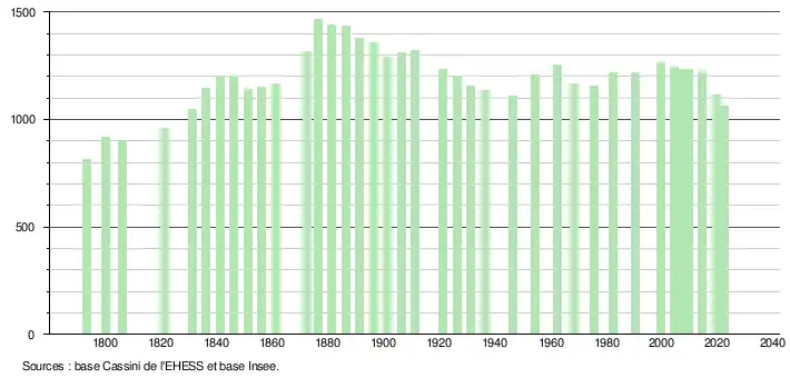 L'évolution du nombre d'habitants est connue à travers les recensements de la population effectués dans la commune depuis 1793. Pour les communes de moins de 10 000 habitants, une enquête de recensement portant sur toute la population est réalisée tous les cinq ans, les populations de référence des années intermédiaires étant quant à elles estimées par interpolation ou extrapolation[25]. Pour la commune, le premier recensement exhaustif entrant dans le cadre du nouveau dispositif a été réalisé en 2004[26].