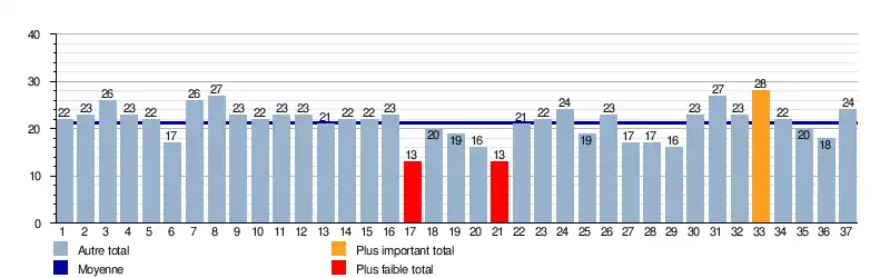 Ce graphique représente le nombre de buts marqués (790 au total cette saison) lors de chaque journée. Il est également indiqué la moyenne totale sur la saison, qui est de 21,35 buts par journée, soit 2,67 par match. Elle est en très légère hausse par rapport à la saison précédente.