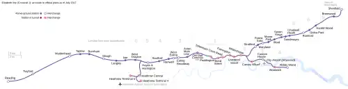 5 Map of the 5th phase of Crossrail 2019 Décembre 2019[7] Mai 2023[14] Mise en service intégrale de la ligne reliant Abbey Wood et Shenfield (en) à l'aéroport Heathrow via Paddington.