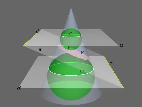 Le théorème de Dandelin permet de placer géométriquement les deux foyers de l'ellipse obtenue par section d'un cône de révolution par un plan, à l'aide des deux sphères inscrites dans le cône et tangentes au plan de section. Un raisonnement analogue permet de prouver que la section d'un cylindre ou d'un hyperboloïde à une nappe par un plan coupant son axe est également une ellipse dont les foyers sont les points de tangence des sphères inscrites dans la surface de révolution et tangentes au plan.