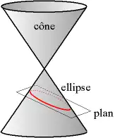 L’ellipse est une courbe plane qui fait partie de la famille des coniques. Elle est obtenue par l’intersection d'un plan avec un cône de révolution (non dégénéré à une droite ou un plan) lorsque ce plan traverse de part en part le cône.