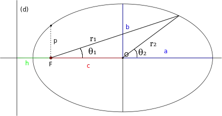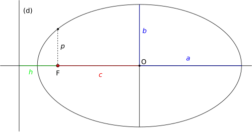 • le « paramètre » de l’ellipse, généralement noté p, représentant le demi latus rectum (corde parallèle à la directrice et passant par le foyer).