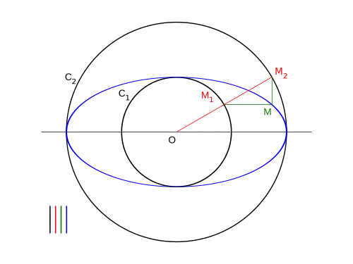 Pour construire le point M de l'ellipse, image du point M2 du grand cercle, on construit le point M1 du cercle (C1) situé sur [OM2]. On mène par M2 une perpendiculaire à (xx’) et par M1 une parallèle à (xx’). Les droites se coupent en M. En effet, si m est le projeté orthogonal de M2 sur (xx’), on a, d'après le théorème de Thalès,