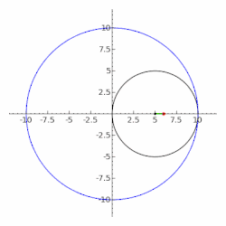 Construction d'une ellipse comme hypotrochoïde : le cercle noir tourne à l'intérieur du cercle bleu, le point rouge décrit alors une ellipse.