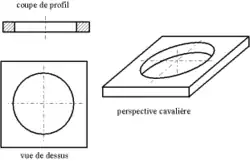En dessin industriel, une ellipse est en général un cercle vu en perspective (une pièce est rarement elliptique même si ce n'est pas exclu), ou bien un perçage en biais par rapport à la surface de la pièce.