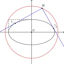 L'ensemble des points M qui « regardent » l'ellipse suivant un angle droit, c'est-à-dire dont partent deux tangentes à l'ellipse perpendiculaires, dessine un cercle de même centre que l'ellipse et de rayon , appelé cercle orthoptique, ou cercle de Monge de l'ellipse[10],[11].